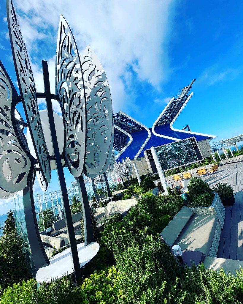 The most relaxing space onboard Celebrity Beyond. Away from the hustle and bustle of the Resort Deck, the Rooftop Garden offers a more tranquil place to escape whilst still enjoying the views. The central part has a large screen which shows films and sporting events, you can also join in with Thai Chi or Pickleball to name a few. Comfortable chairs and loungers surround this area alongside hundreds of REAL plants which just add to the ambience.