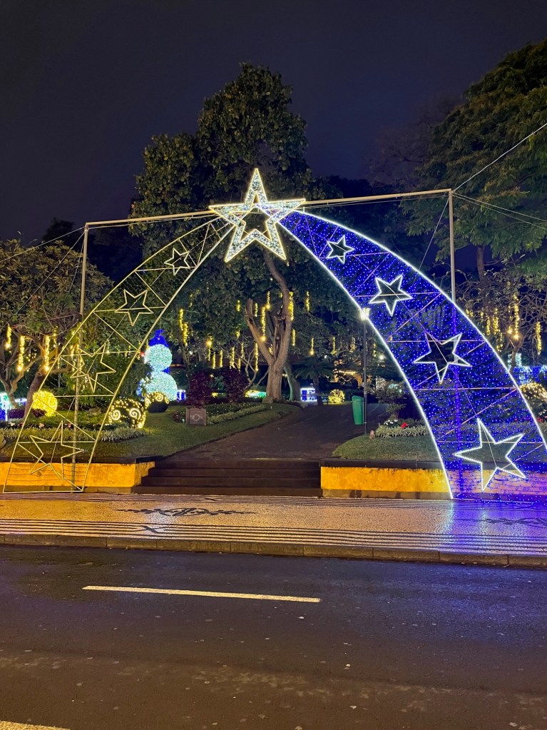 Just after the museum and across the road, there is stepped access up to Parque de Santa Catarina which offers great views over the bay and out to sea; another great point to take photos and see the ships in port. As the sun went down the Christmas lights came on and we walked around 8km in total trying to take in as many as possible. A particular highlight being the Jardin Municipal de Funchal with: snowmen, Santa’s and sleighs dotted around the park. We did notice that the light displays had been updated since our last visit, proving Funchal obviously put in a lot of investment to this experience.