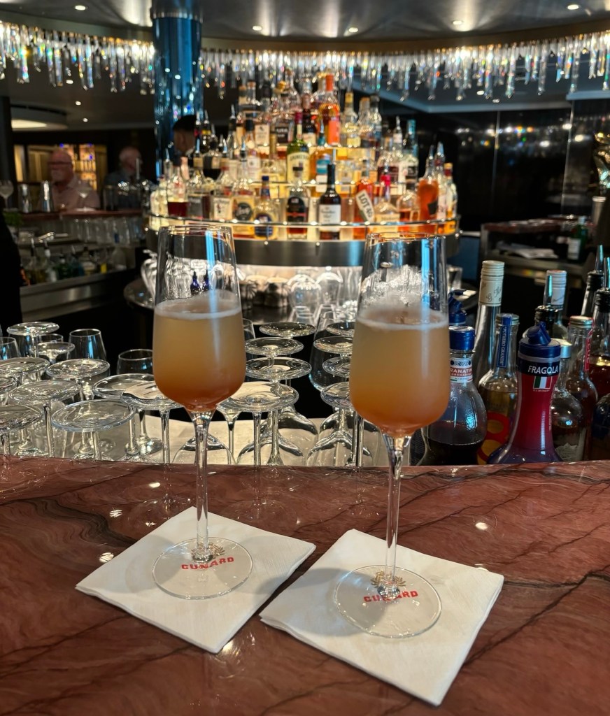 Designed with a circular bar for you to sit at and chat to the crew, this bar is situated in the heart of the ship, just off the Grand Lobby and is the perfect spot for people watching day or night. There’s also ample seating surrounding the bar if you fancy retreating away to take in the view or read a book; the Chart Room is popular throughout the day serving coffees alongside your favourite tipple. When the strings are being played in the Grand Lobby, the ambiance goes up another notch. A particular favourite was the Cunard Gold (served on draught or in a can) as well as the Queen Anne gin.