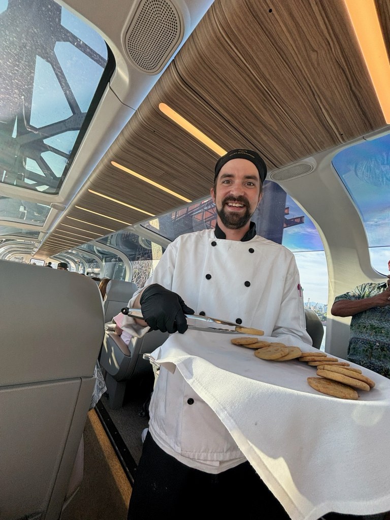 However, as the railroad widens and more sidings come into view along with graffitied bridges, you know you’re reaching your destination. The ‘closing party’ starts long before the arrival with the crew handing out a final round of drinks to toast all the special occasions guests are onboard for. There’s also time to show appreciation to the chefs as they deliver a final cookie treat.